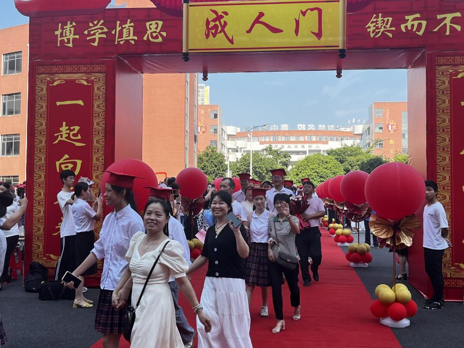 典礼为1400名高三学子颁发毕业证书。随后,家长为孩子们冠戴成人帽,孩子们挽着家人的手,骄傲地走过成人门。