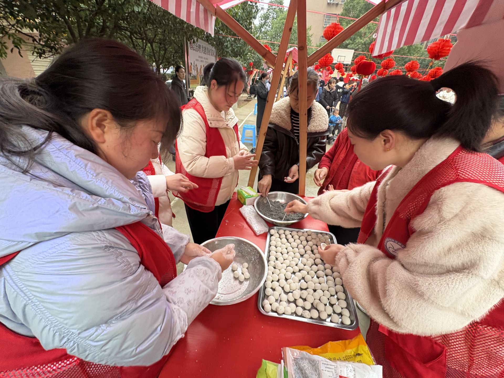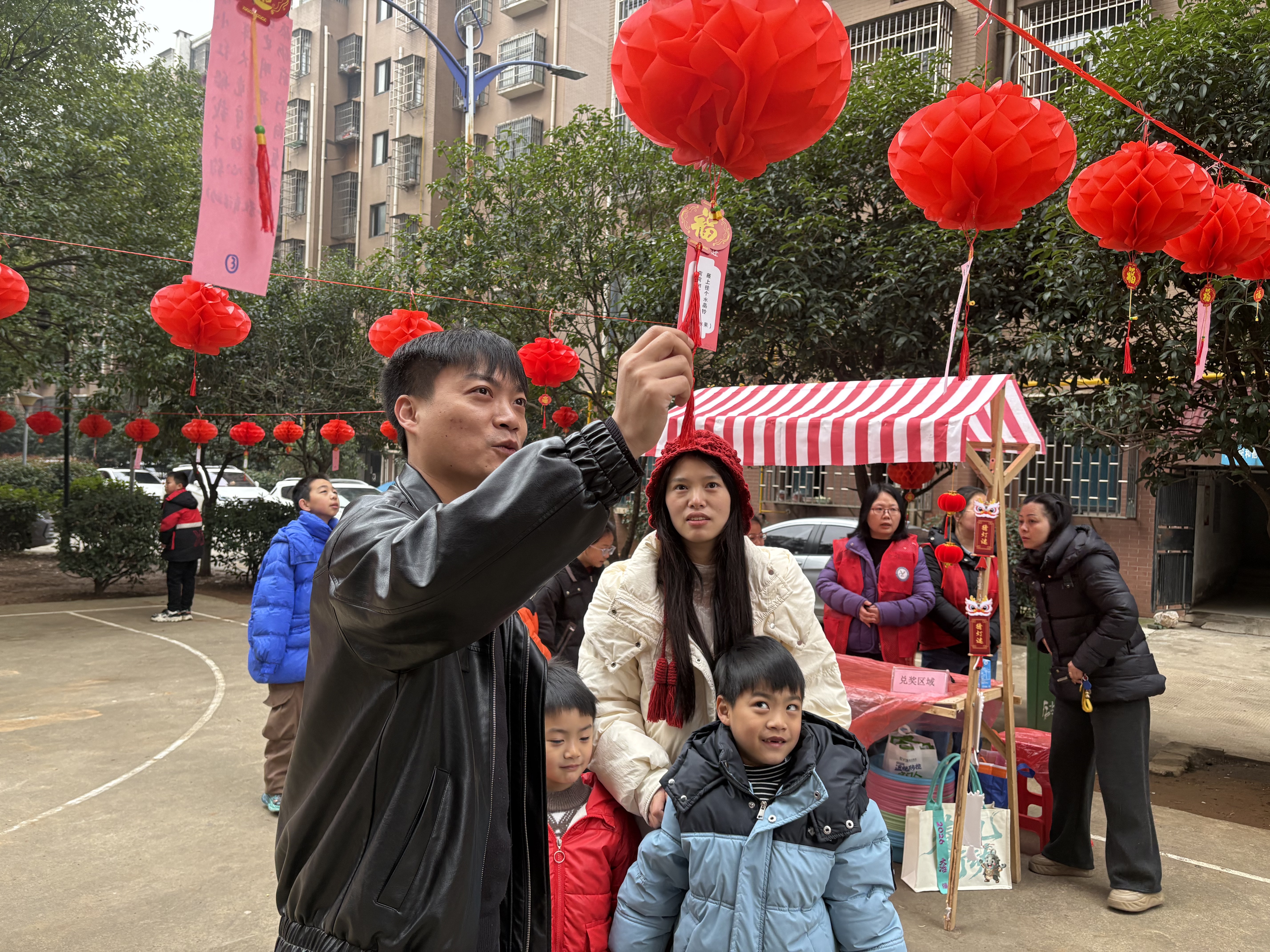 民俗体验区内,传统文化韵味十足。汤圆制作台前,食材齐备、工具齐全,在居民能手的带领下,大家围坐一起揉面团、包馅料,在欢声笑语中切磋技艺、拉近距离;灯谜区灯笼高挂、趣味盎然,谜面巧妙融合古典诗词、垃圾分类等知识,居民踊跃参与、乐在其中。