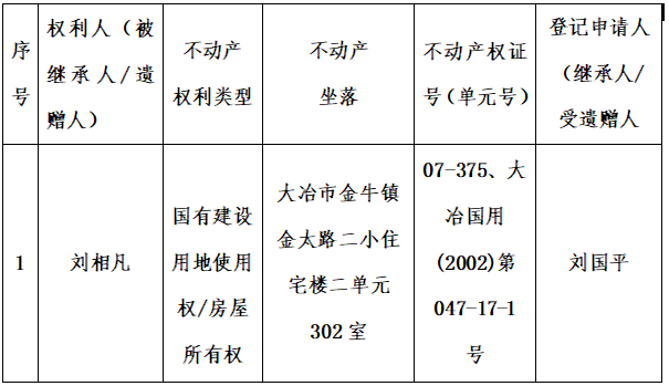大冶市不动产登记中心不动产权继承公告(2026) 第175号