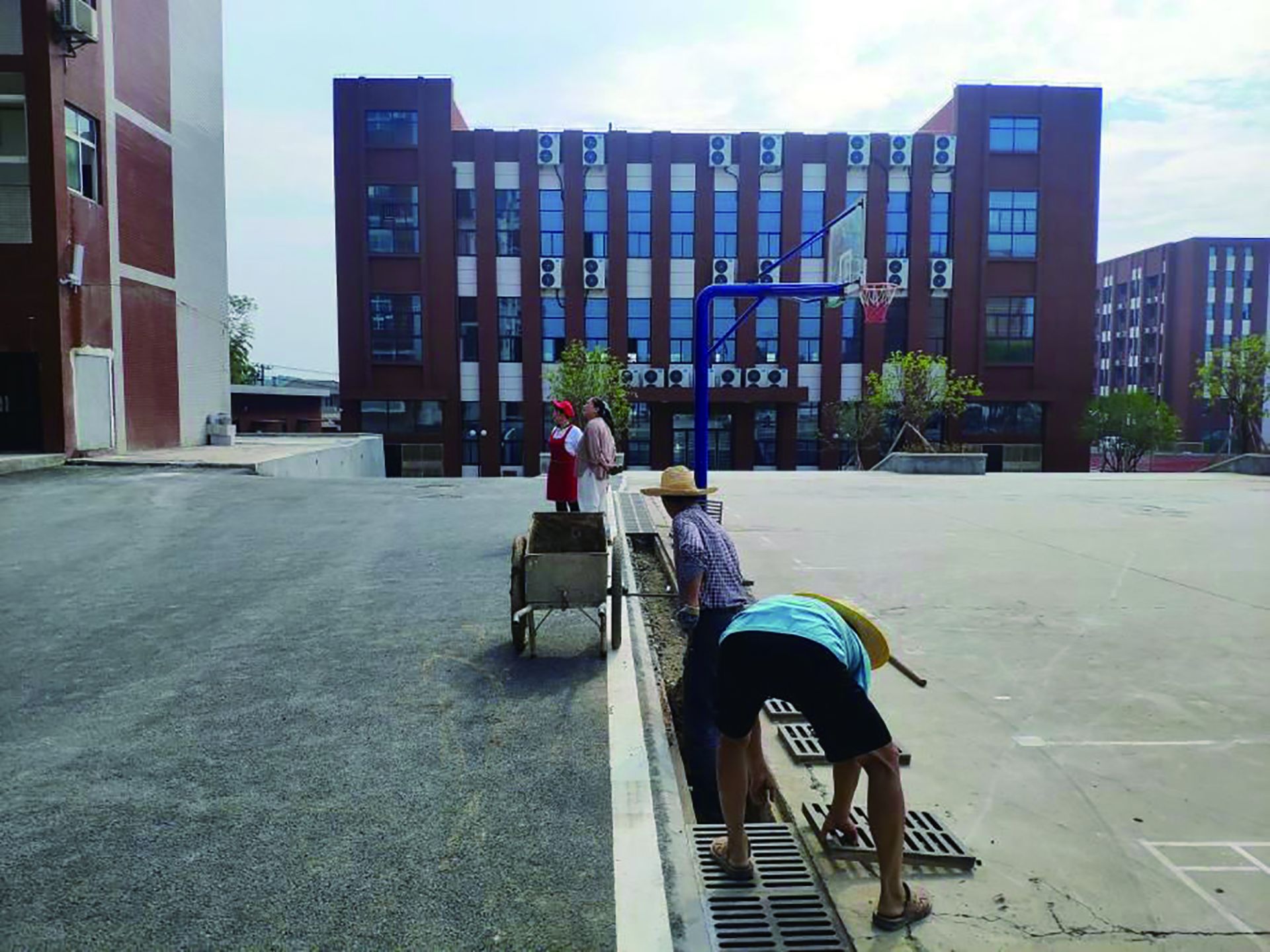 校园内,工人们正在紧张有序地忙碌着,教学楼门前有人在清理排水沟,运动场看台上有人在安装装饰板,操场边有人在安装护栏……