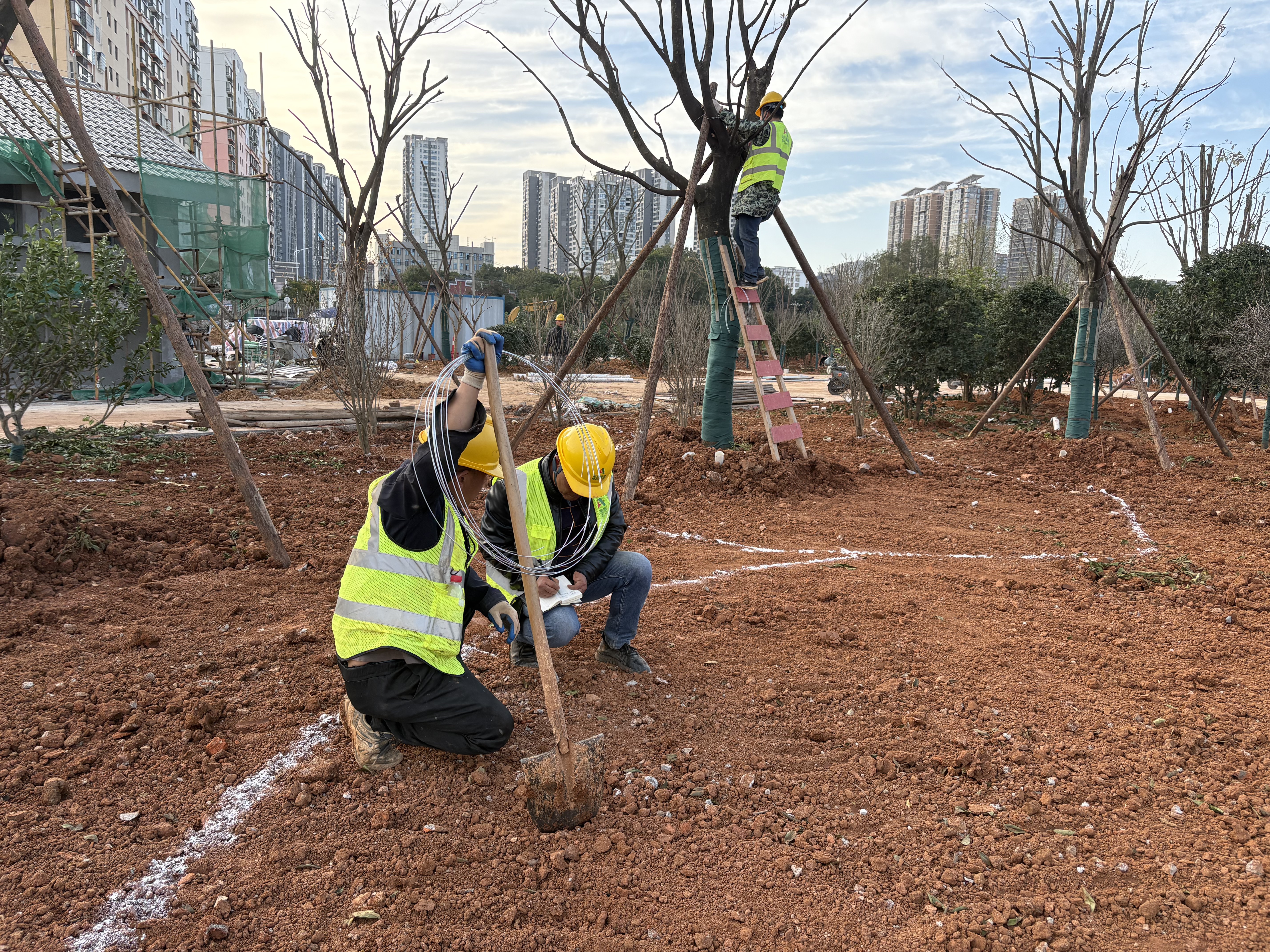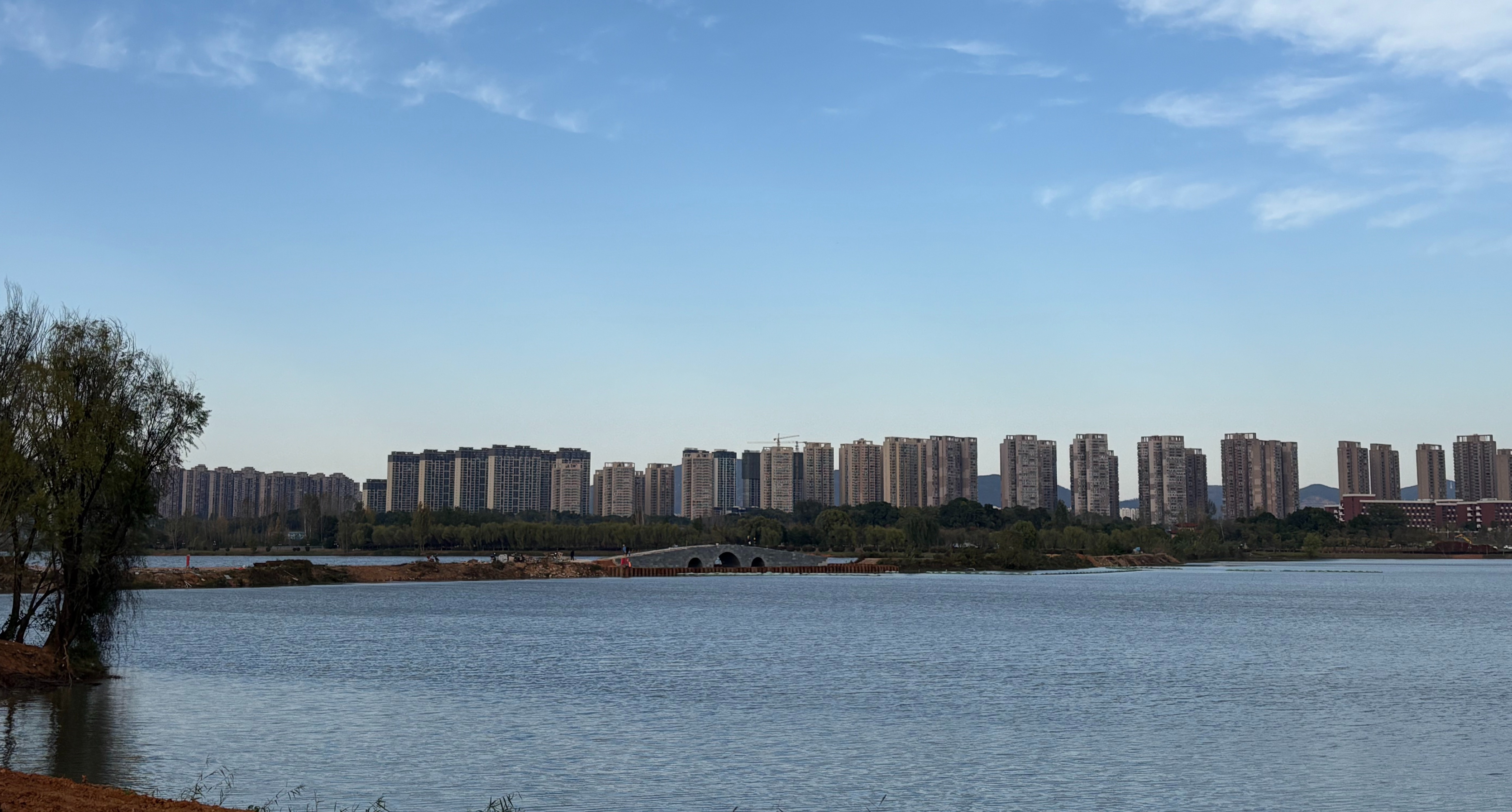 11月18日,尹家湖西南岸建设正酣:挖掘机轰鸣作业,施工人员分头推进排水铺设、公厕装修、绿植栽种与花坛塑形,忙碌身影与新生绿意相映成趣,绿色生态门户雏形渐显。无人机视角下,1.98公里滨水绿道蜿蜒延伸,串联起游园广场、亲水栈道等景点,这里将成为市民休闲观光的优选之地。