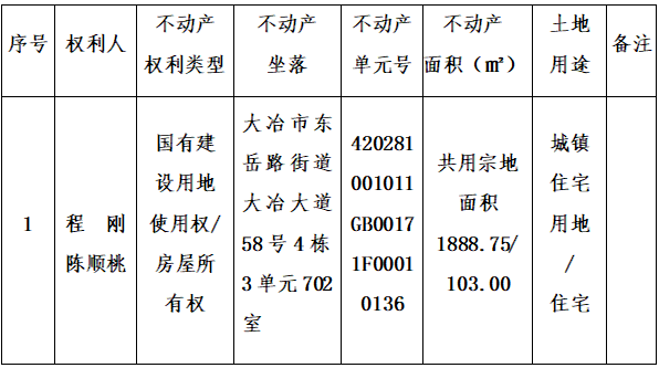 程刚、陈顺桃对坐落于大冶市东岳路街道大冶大道58号4栋3单元702室不动产申请登记,经审核,程刚、陈顺桃已取得《房屋所有权证》(证号:大冶市房权证01字第20598号、大冶市房权证01字第20599号),土地证未办。因转让方柯中光不能到不动产登记机构申请签章,现依照《不动产暂行条例》、《不动产暂行条例实施细则》之规定,我中心对该申请予以审查并予公告。如有异议者,请自本公告刊登之日起十五个工作日内将异议书面材料送达大冶市不动产登记中心综合窗口。公告期满无异议或者异议不成立的,我机构将予以登记并颁发不动产权证书。
