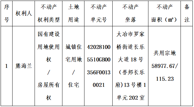 熊海兰对坐落于大冶市罗家桥街道长乐大道18号(誉邦长乐府)13号楼1单元202室,申请转移登记(继承),现根据《不动产登记暂行条例》、《不动产登记暂行条例实施细则》、《不动产登记操作规范(试行)》之规定,对该申请予以审查并予公告。如对上述内容有异议,请自本公告之日起十五个工作日内将异议书面材料送达大冶市不动产登记中心。逾期无人提出异议或者异议不成立的,我机构将予以登记并颁发不动产权证书。