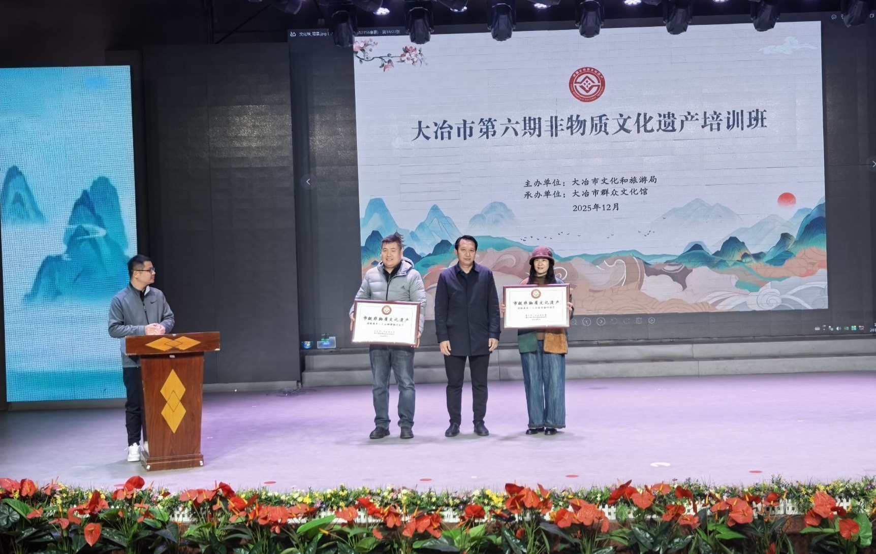 会上,市文旅局相关负责人为第七批黄石市非物质文化遗产代表性项目“大冶铜雕制作技艺”“大冶拼布制作技艺”颁发牌匾,并向彭涛、项祥发、陈浩洋、周会文、孙质兰、谈桔红等6位第五批黄石市非物质文化遗产代表性传承人颁发证书。