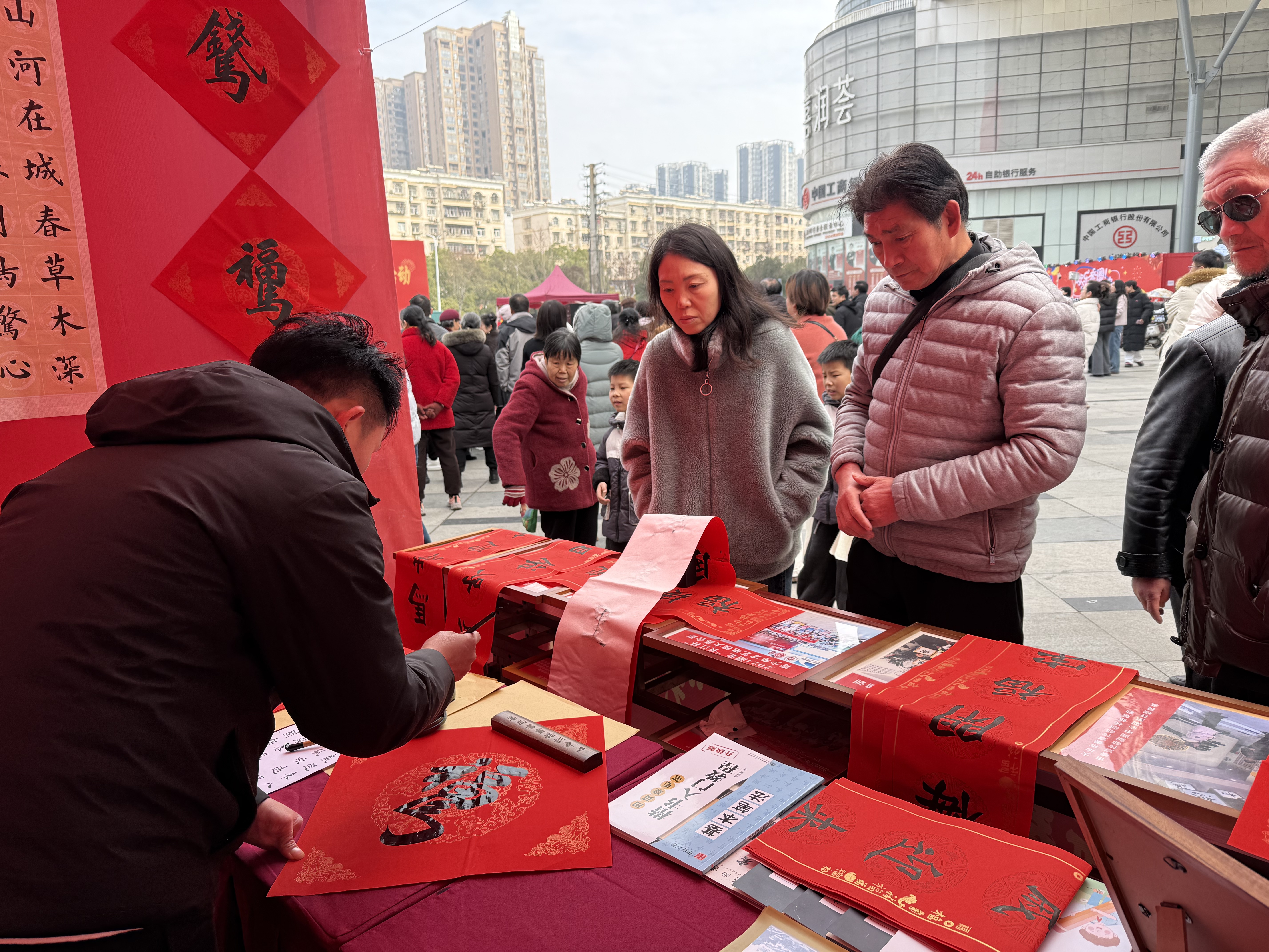 书法展位前始终人气高涨,大朋友小朋友围在案前,或在书法家指导下提笔写“福”,或兴致勃勃地挑选春联。大冶墨尚书画培训中心负责人项瑞杰说:“我们把‘马’字和‘福’字结合,寓意‘马上有福’,很受欢迎。这个集市为我们艺术机构提供了宝贵的展示平台,我们现场送春联、免费教学,让更多市民了解艺术、参与进来,一起感受热腾腾的年味。”
