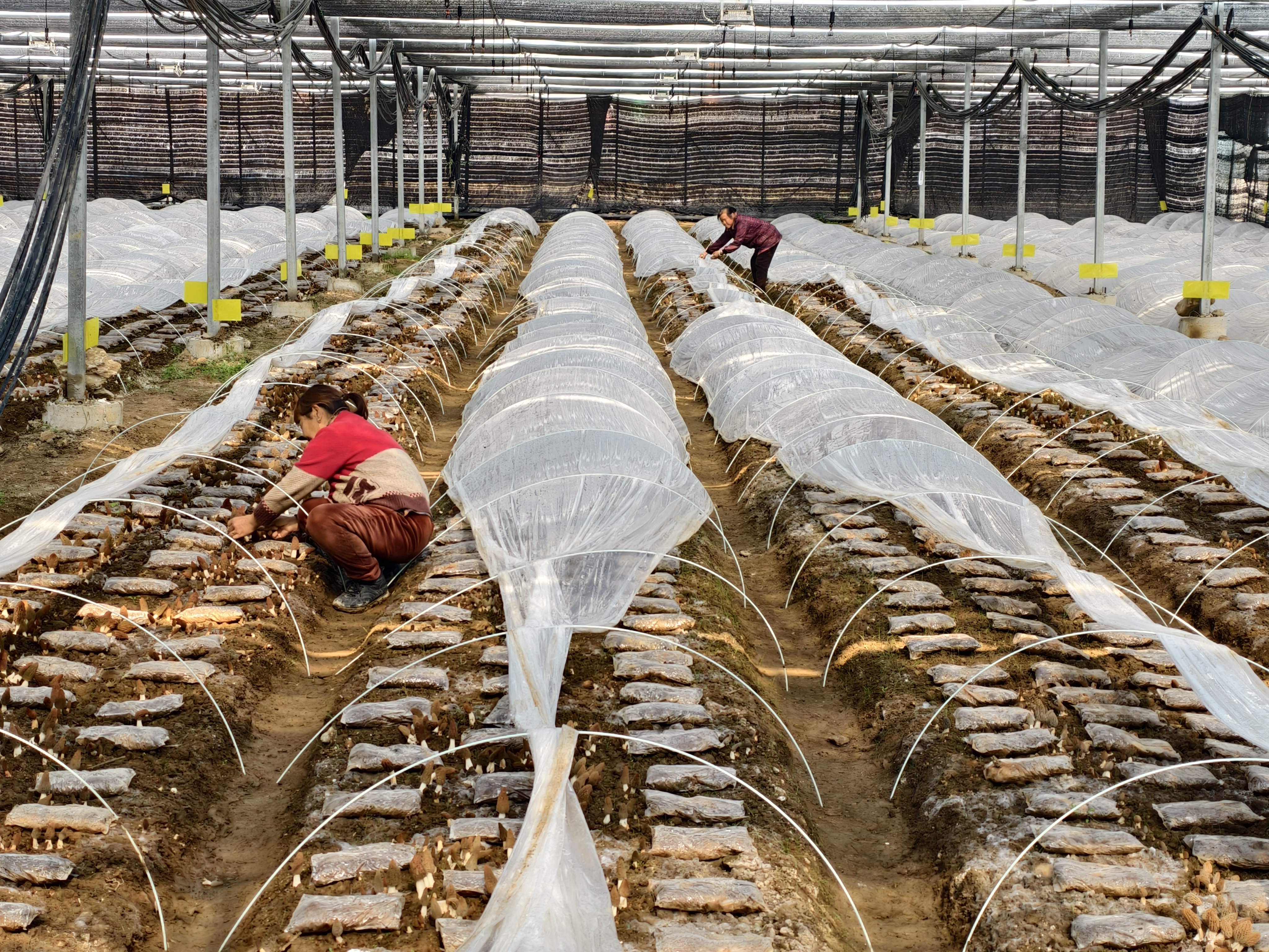 为进一步降本增效,火石村还自主研发出菌菇营养包,成本从原先采购的每包5元降到2元。从营养包配比到出菇管理,一整套技术已被村民们熟练掌握,实现了从“靠经验”到“凭技术”的跨越。“我们采用电动棚膜精准控温,让棚内温度始终保持在8到12摄氏度这个最佳区间。”陈忠说。此外,架设在钢架上的喷灌管网与铺设在地面的滴灌管网,共同组成水肥一体化自动灌溉系统,喷洒时机与用量都经过科学测算,既省人力,又提产量。在这种标准化种植模式下,羊肚菌亩产可达800斤左右,效益十分可观。