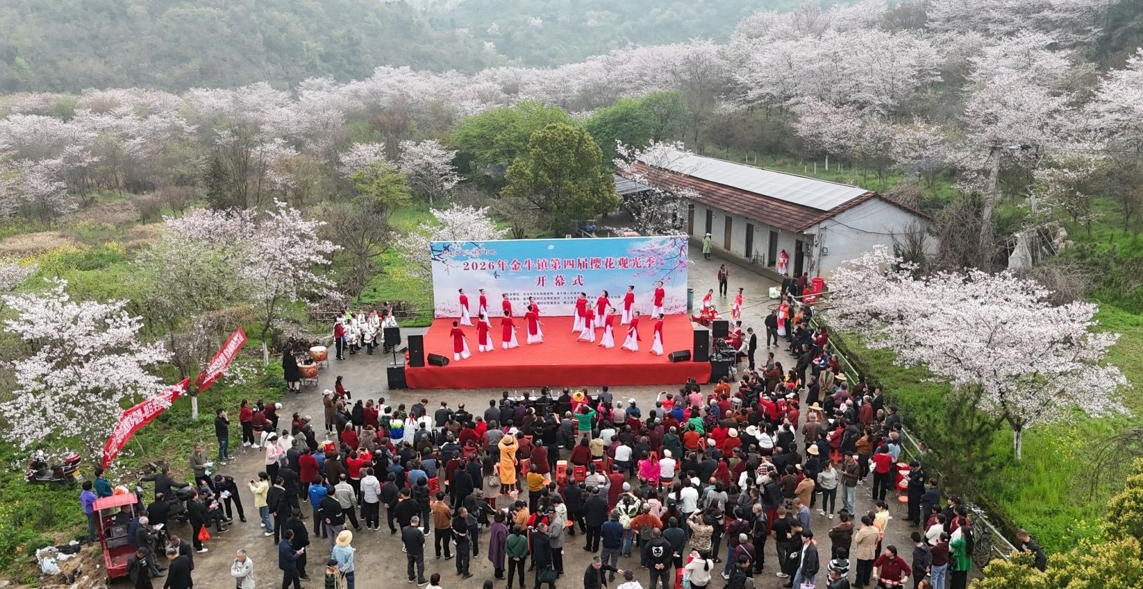 就在这片烂漫春光里,金牛镇第四届樱花观光季开幕式缓缓拉开帷幕,精彩的文艺汇演同步上演。表演者身姿曼妙、歌声婉转,与漫天樱花相映成趣。