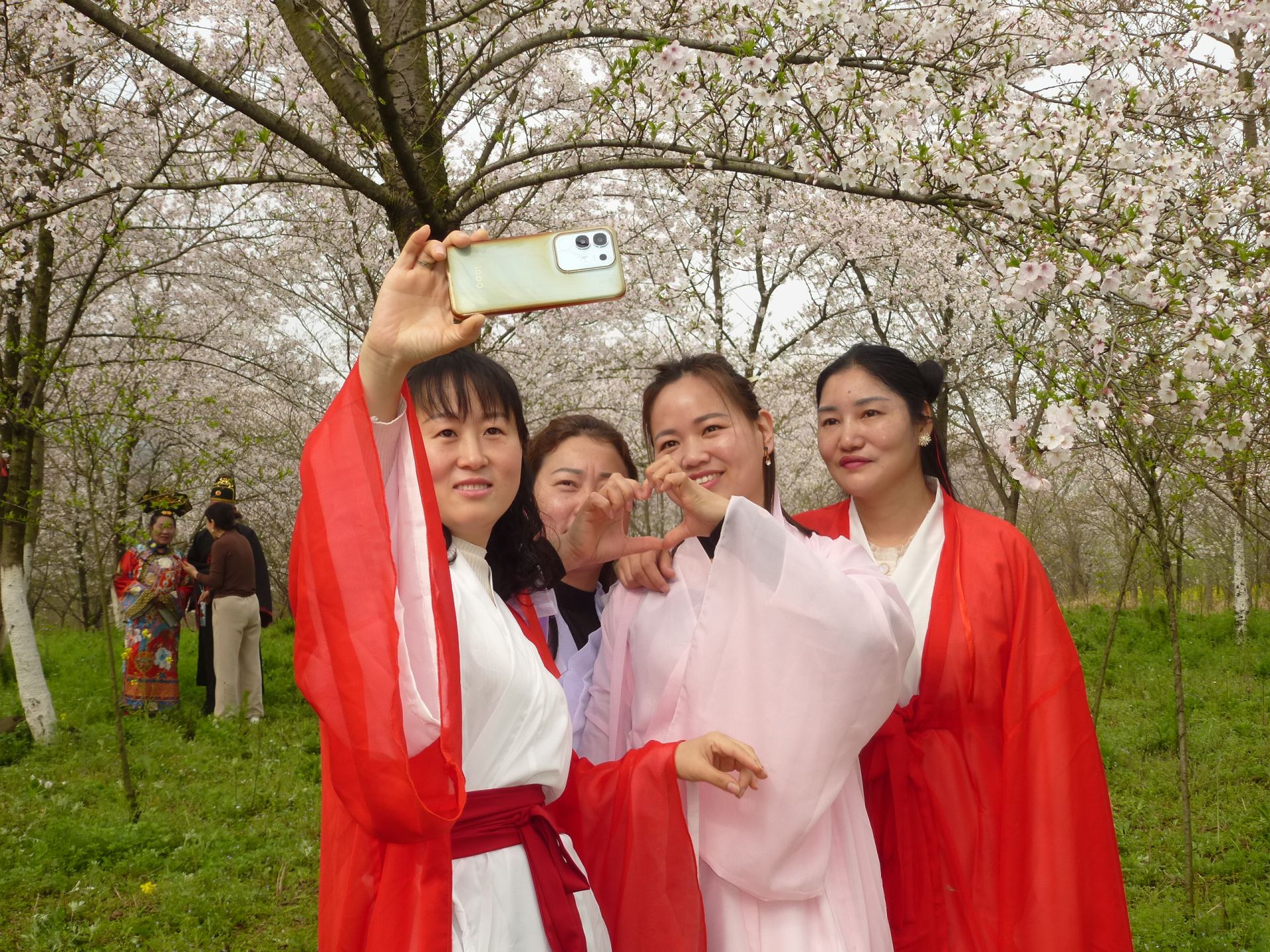 “这里樱花品种多、规模大,随手一拍都是美景,既能赏樱又能亲近自然,特别惬意。”游客殷秀梅约上闺蜜前来游玩,为定格这春日盛景,她们特意换上古装,在粉白花海中更添几分古典韵味。樱花林间,游客们三五成群、步履悠然,或驻足细赏花瓣轻舞,或与花海合影留念,孩子们在花下追逐嬉戏,欢声笑语在山谷间回荡,一派生机盎然的春日图景。