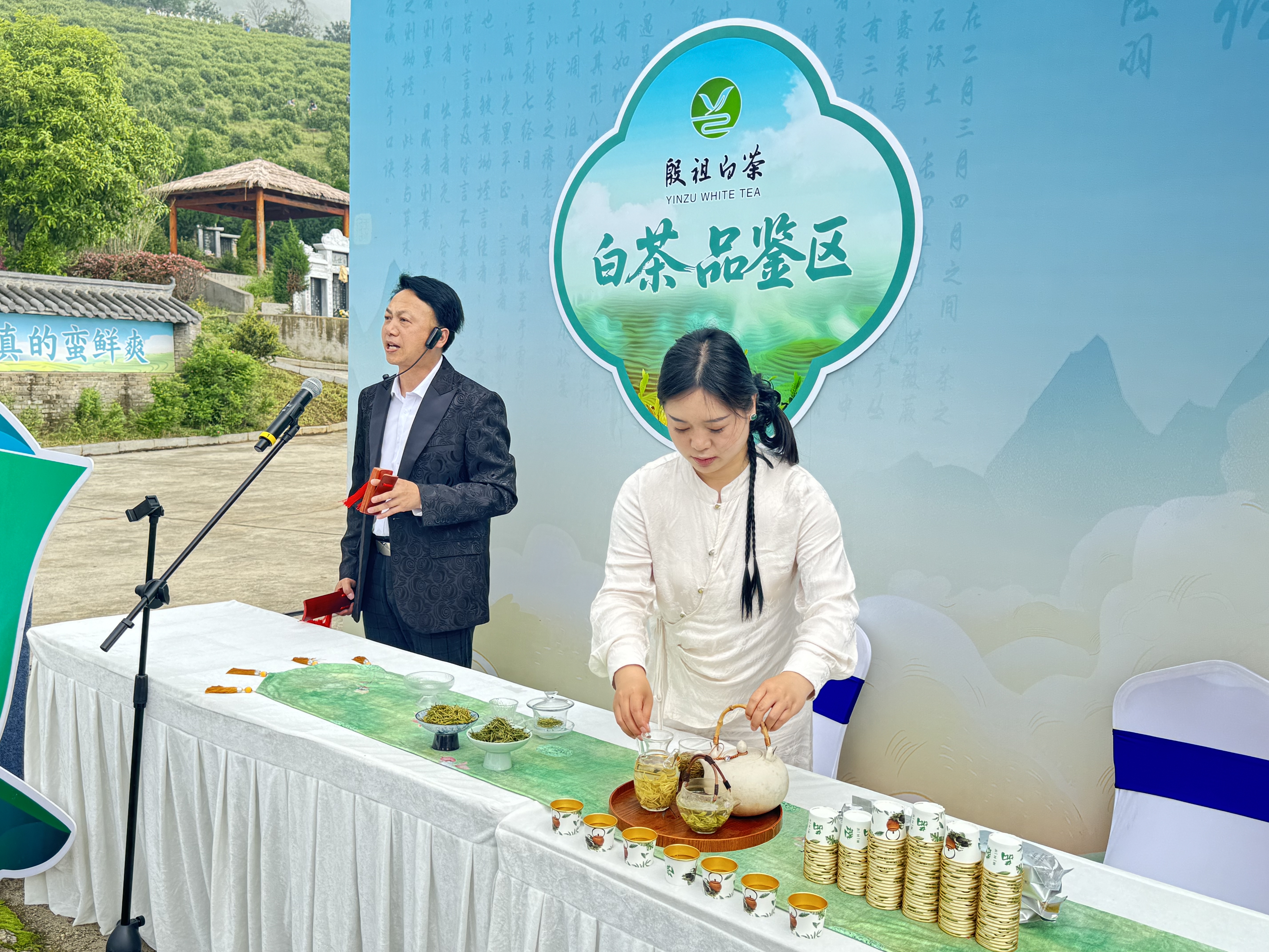 发布会现场专设的白茶品鉴区前,围满了前来尝鲜的游客和当地茶农。玻璃杯中,殷祖白茶形似凤羽,芽叶玉白,茎脉翠绿,汤色清亮,随着茶香袅袅升起,沁人心脾。