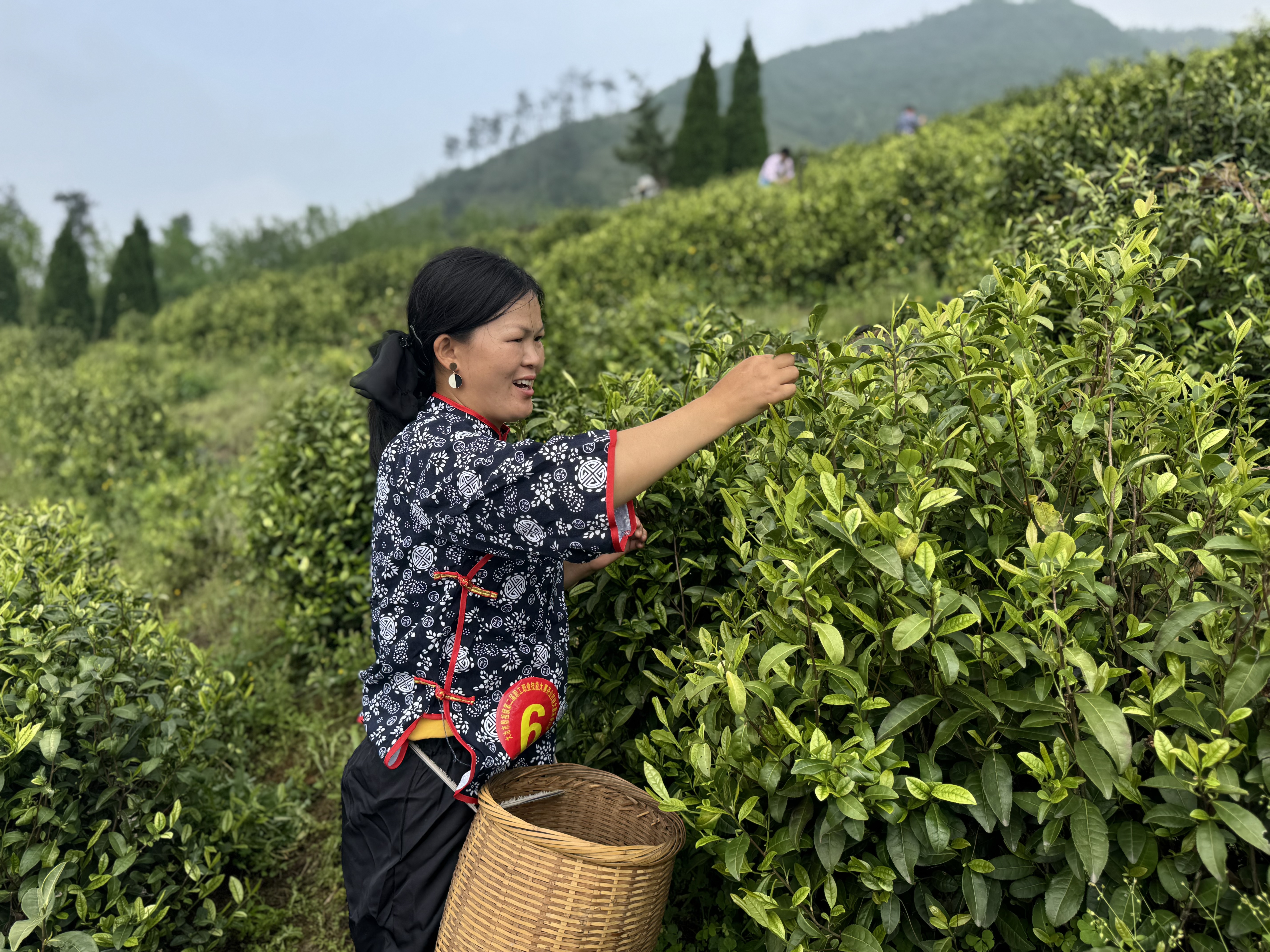 茶园深处,十几名身着蓝布碎花衣的采茶女正巧手翻飞,一芽一叶落入竹篓,成为镜头追逐的焦点。她们指尖轻捻,动作娴熟,一捏一提间,鲜嫩的茶芽便稳稳落入篓中。蜿蜒的茶垄间,几位汉服爱好者手持团扇,漫步打卡,衣袂与茶香共舞,裙裾随风轻扬,仿佛从古画中走出的采茶仕女。