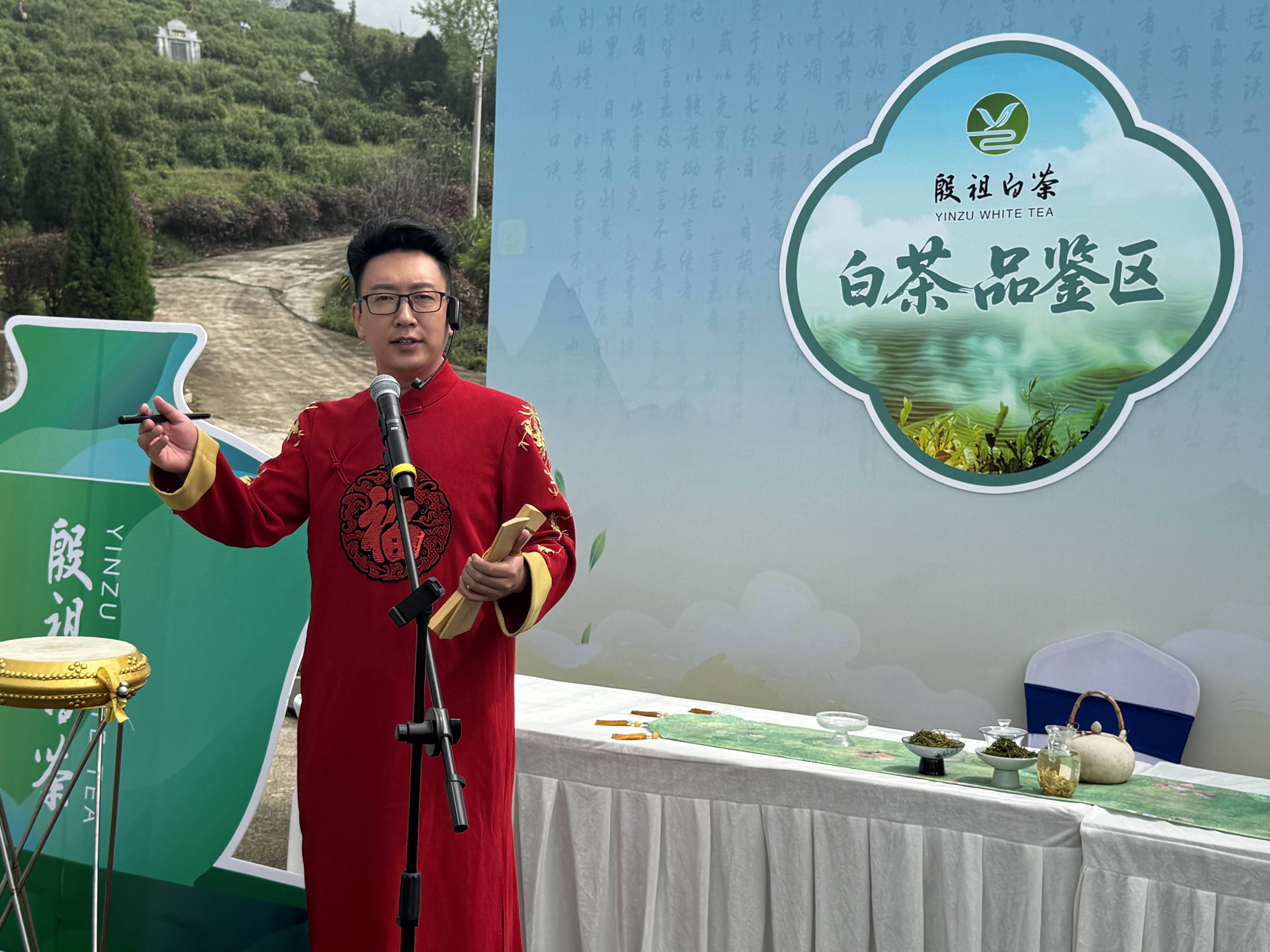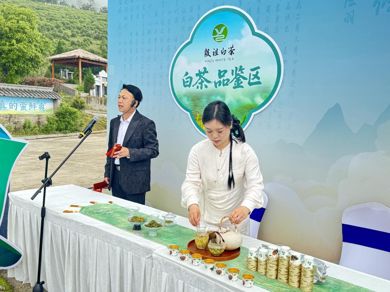 发布会现场,专设的白茶品鉴区前围满了游客和当地茶农。玻璃杯中,殷祖白茶形似凤羽,芽叶玉白、茎脉翠绿,汤色清亮,茶香袅袅,沁人心脾。