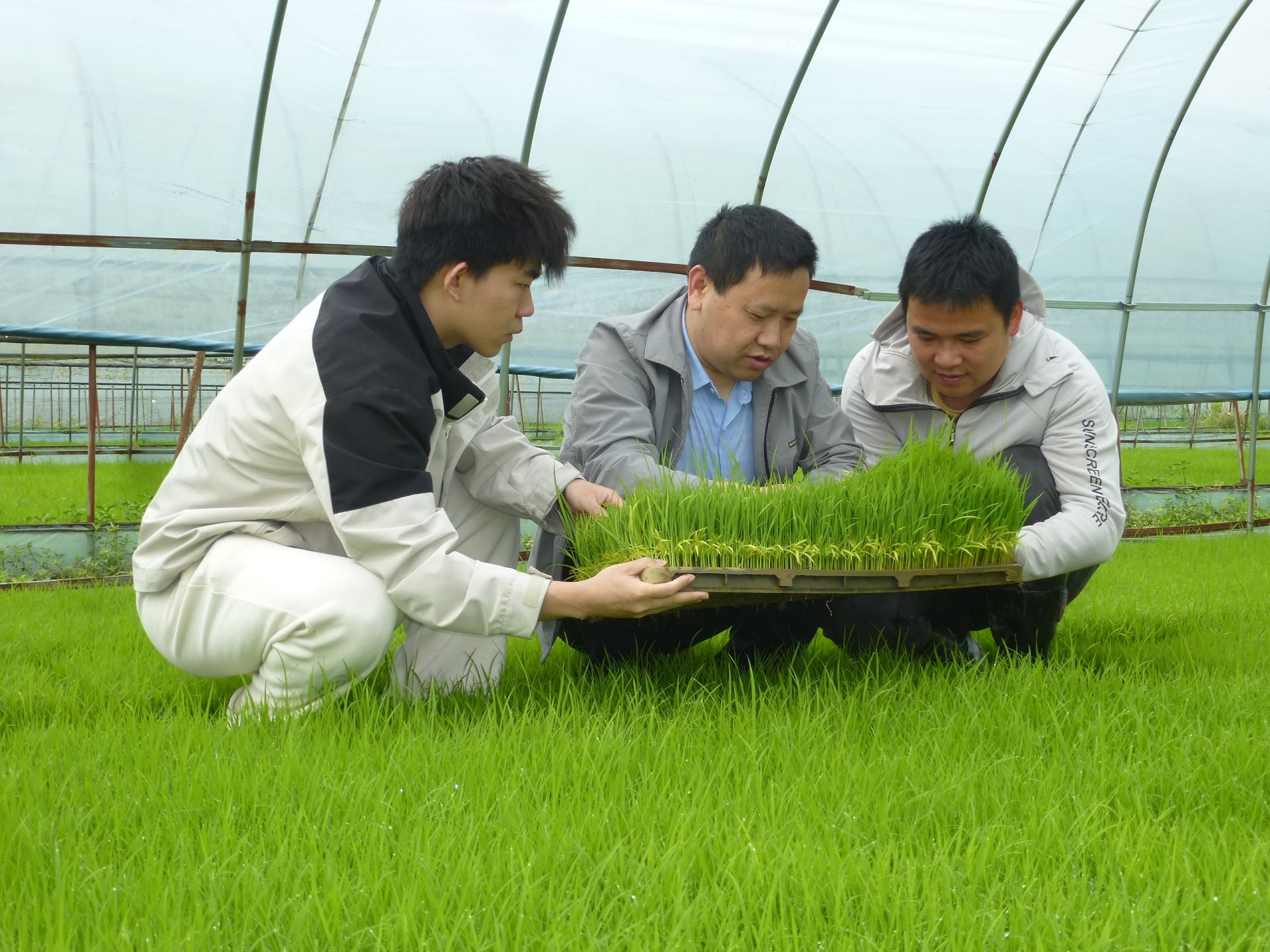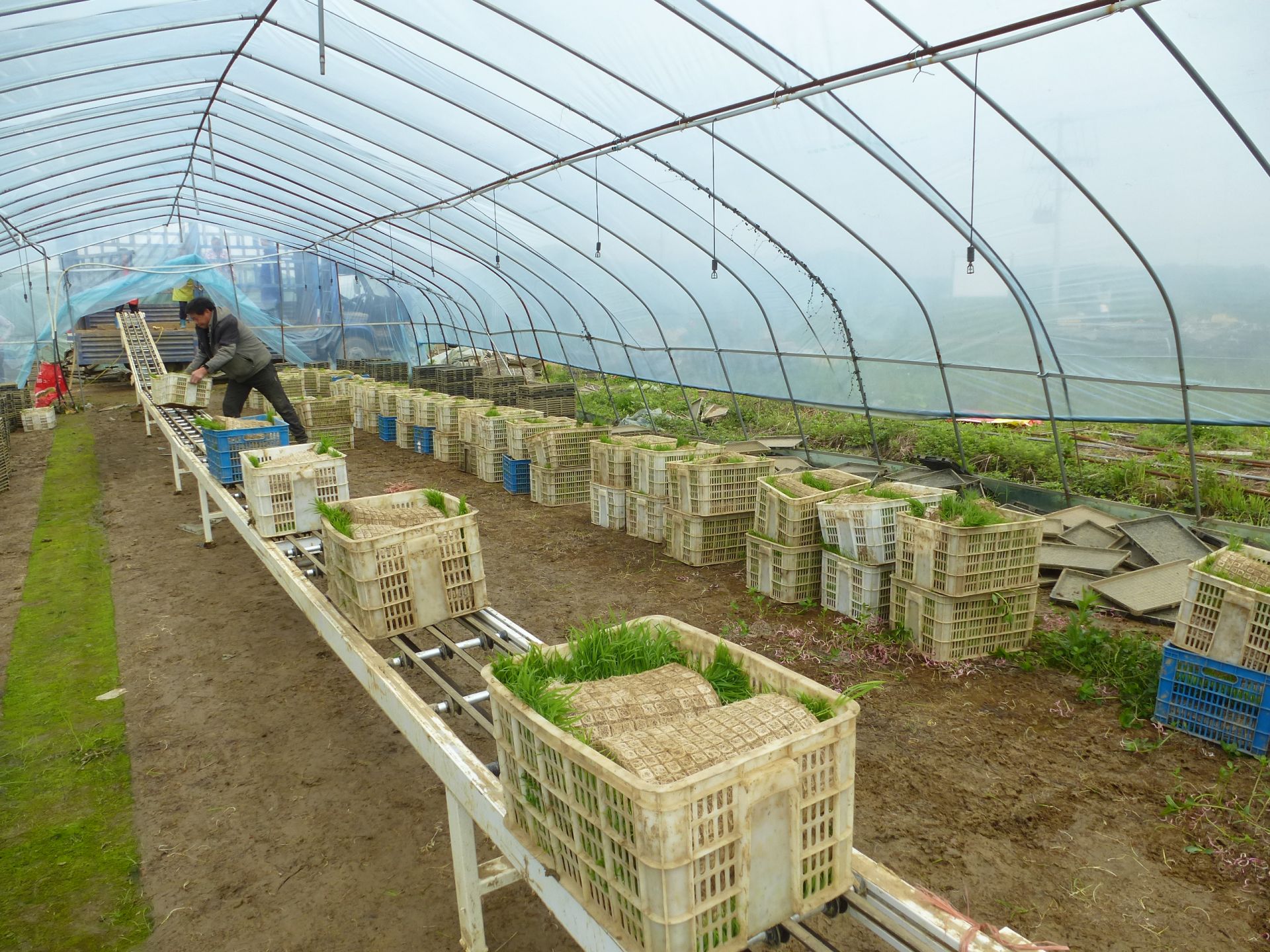 4月24日,记者在还地桥镇南石村学文育秧工厂的水稻育秧大棚看到,一盘盘嫩绿的秧苗整齐排列、长势喜人,几名工人正将装好秧苗的塑料筐装车,这批秧苗将运往周边村组种粮大户的待插秧田,及时移栽下田。