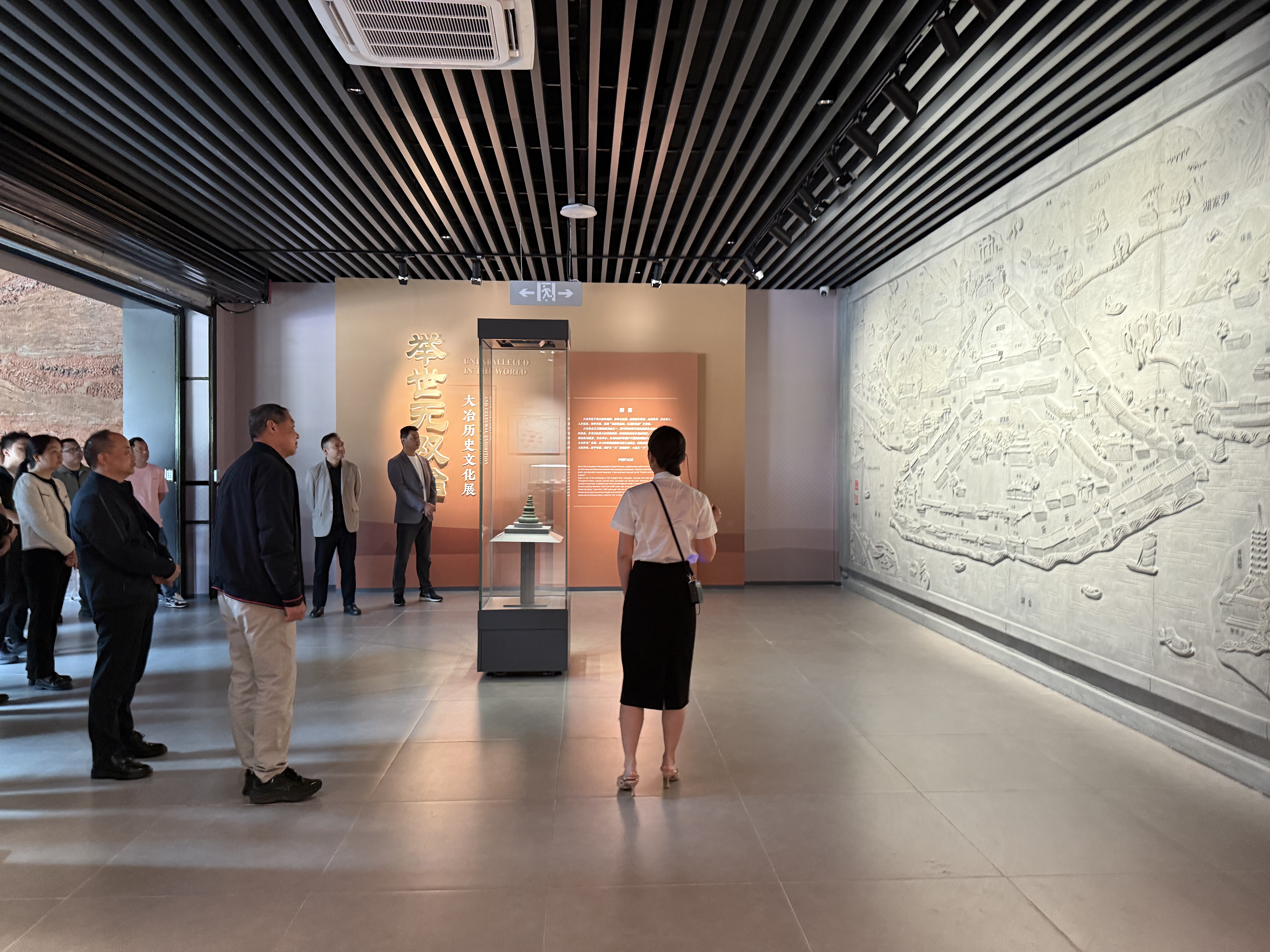 步入馆内,入口处“举世无双冶”几个大字映入眼帘,一幅气势恢宏的青石深浮雕《千年古县·大冶清代古城图》随之铺展。该浮雕以清同治《大冶县志》为历史蓝本,深度还原县志原图风貌,融合尹解元石雕非遗技艺,生动再现了千年古县的繁华景象。