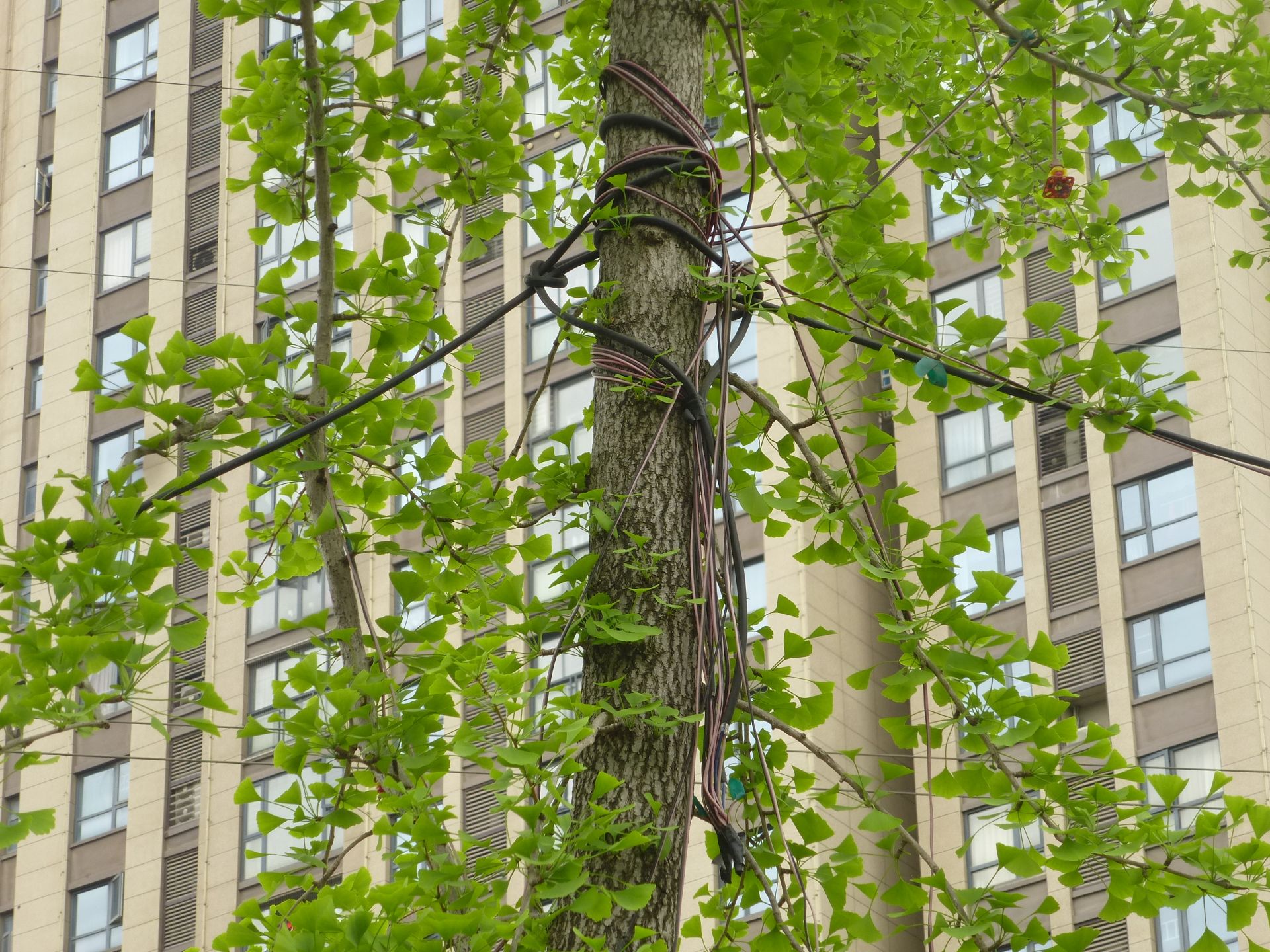 【民情直通车】行道树上缠绕废弃电线和灯带 城管部